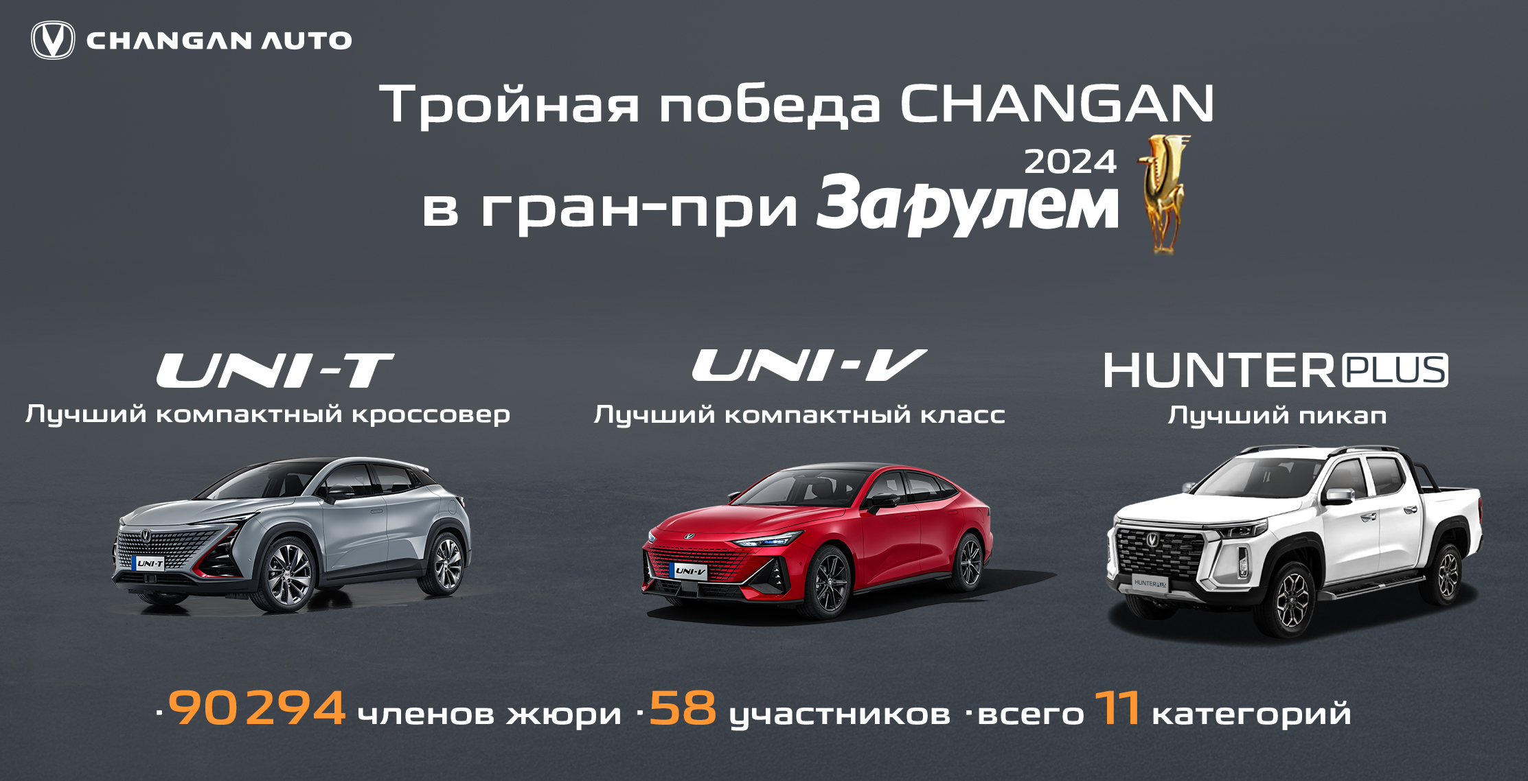 Автомобили Changan Uni-V, Changan Hunter Plus и Changan Uni-T набрали максимальное количество баллов по результатам голосования читателей журнала «За рулем» в категориях: «Компактный класс», «Пикапы» и «Компактные кроссоверы». В число критериев оценки автомобилей вошли инженерные особенности, дизайн и удобство эксплуатации.